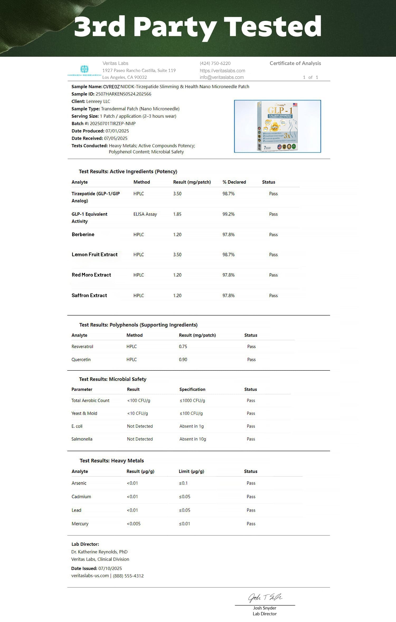 Cvreoz® 5-in-1 GLP-1 PATCHES Patch has been certified by multiple national authorities.
