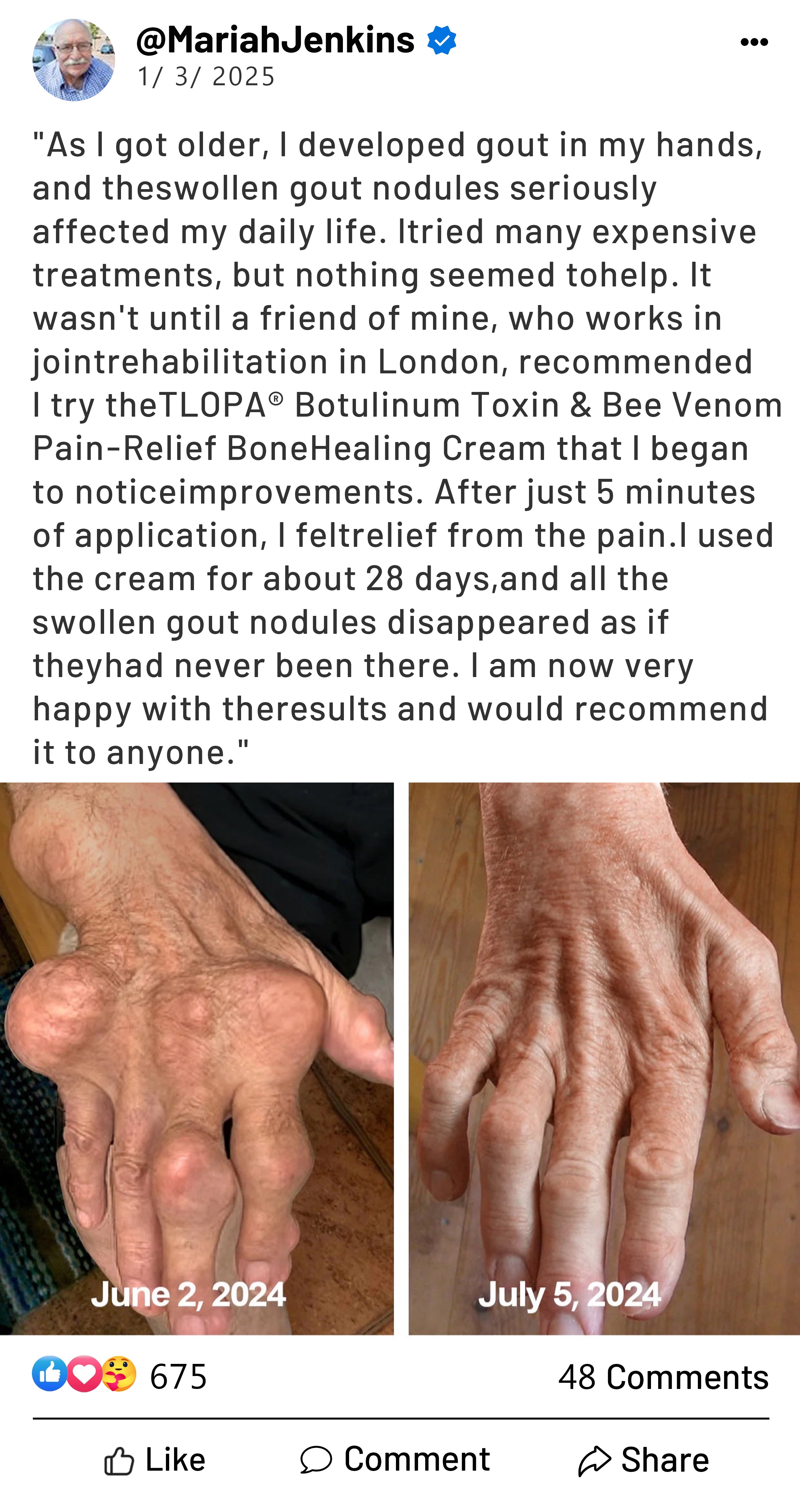 TLOPA® Botulinum Toxin & Bee Venom Pain-Relief Bone Healing Cream contains six proven, powerful ingredients that have been used to effectively treat arthritis and bone-related conditions in millions of people around the world.