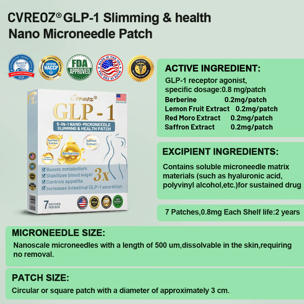 Cvreoz® GLP-1 five-in-one NANO MICRONEEDLE Slimming & Health PATCHES combined GLP-1 with four clinically studied, all-natural extracts—delivered through dissolvable nanoneedles—to help your body repair itself and accelerate weight management.
